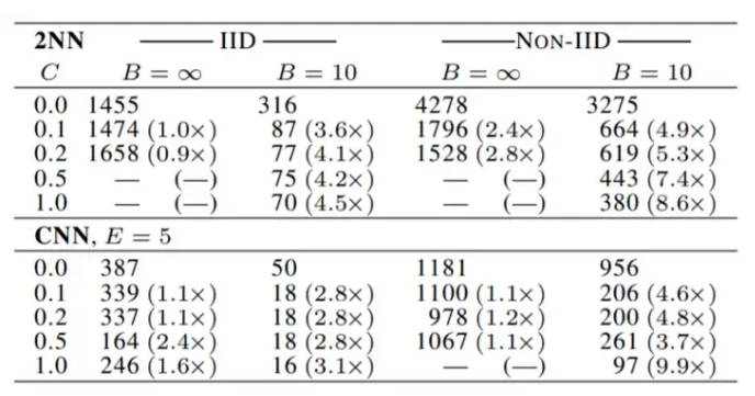 여기서 저자는 각 작업당 client가 갖는 local update 횟수와 B를 조절하며 실험 합니다.