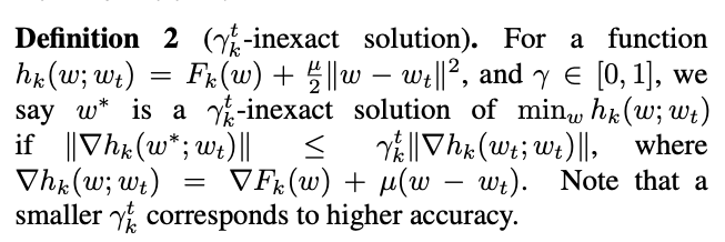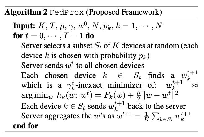 즉, 훈련 프로세스 전체에 걸쳐 모든 장치에 대해 균일한 γ를 가정하는 대신 FedProx는 다른 장치와 다른 반복에서 변수 γ를 암시적으로 수용합니다.