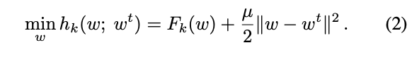 이에 변수 로컬 업데이트의 영향을 효과적으로 제한하기 위해 로컬 하위 문제에 Proximal term을 위와 같이 삽입해 가중치의 발산을 제한 합니다. 특히 로컬 함수 Fk(·)를 최소화하는 대신 장치 k는 지정된 목적함수를 사용하여 최소화합니다.