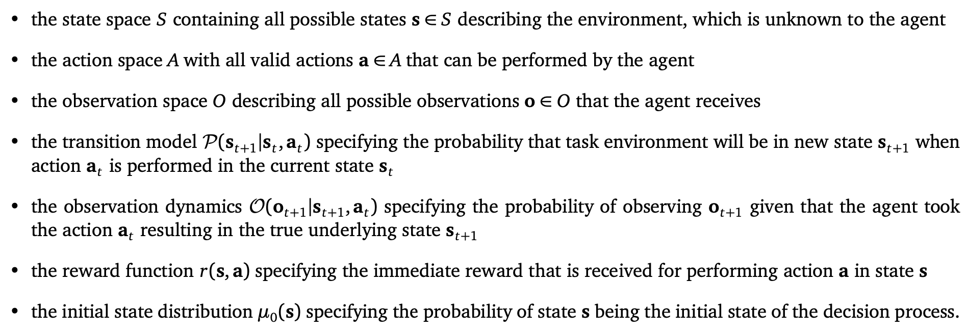 - Belief state : 이 접근 방식에서는 실제 agent가 겪어온 환경과의 상호작용과 그 보상을 history로 사용하는 대신 충분한 통계적 history를 사용합니다. 이 history는 Belief state으로, 에이전트에게 과거 관찰 및 행동이 주어진 현재 기본 상태에 대한 에이전트의 현재 믿음을 나타냅니다: $b_t (s_t ) = p(s_t |o_1:t , a_1:t )$. 예를 들어 두 개의 개별 상태 s_0과 s_1이 있는 POMDP가 있다고 가정해봅니다. 이 때 신뢰 상태는 0과 1 사이의 1차원 벡터로 지정됩니다. 일종의 확률이라고 생각해도 무방합니다. 여기서 0은 환경이 s_0에 있고 1은 s_1에 해당한다는 믿음(확률)입니다. 0과 1 사이의 어떠한 값(확률)에 의해 0 < p < 1은 환경이 s_0에서 확률 1 - p이고 s1에서 확률 p라는 믿음을 바탕으로 action을 수행합니다. 이에 이 Belief state를 사용하여 Belief state에 기반한 보상 함수 및 전환 함수를 도출할 수 있습니다. 그러나 이 경우 추가적으로 연속 상태와 D-차원 신뢰 벡터 $(D = |S|)$가 있는 MDP가 추가적으로 정의되어야 합니다. 또한 새로운 관찰과 행동이 주어지면 현재 Belief state을 업데이트하는 방법 또한 필요합니다.